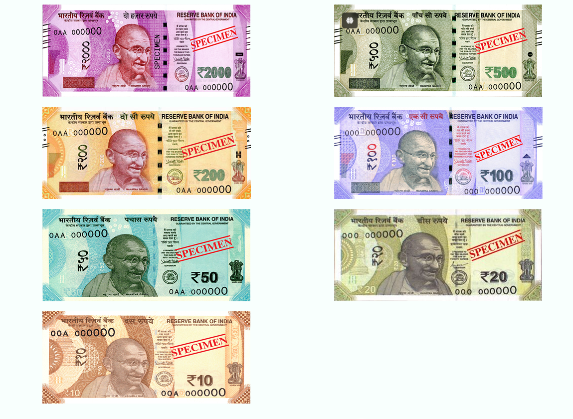 The new design banknotes are distinctly different from the current Mahatma Gandhi Series of banknotes in color, size, and theme. The theme of the new series of notes is India’s heritage sites.